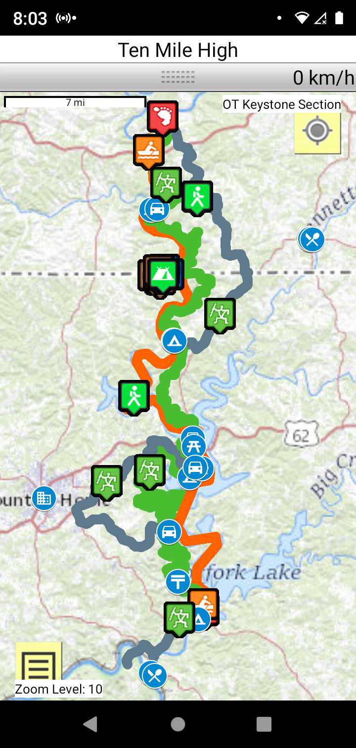 78 mile keystone section between Techumsa, MO and Lake Norfork dam, AR. Some sections are under construction. The trail is on Corp of Engineer property.